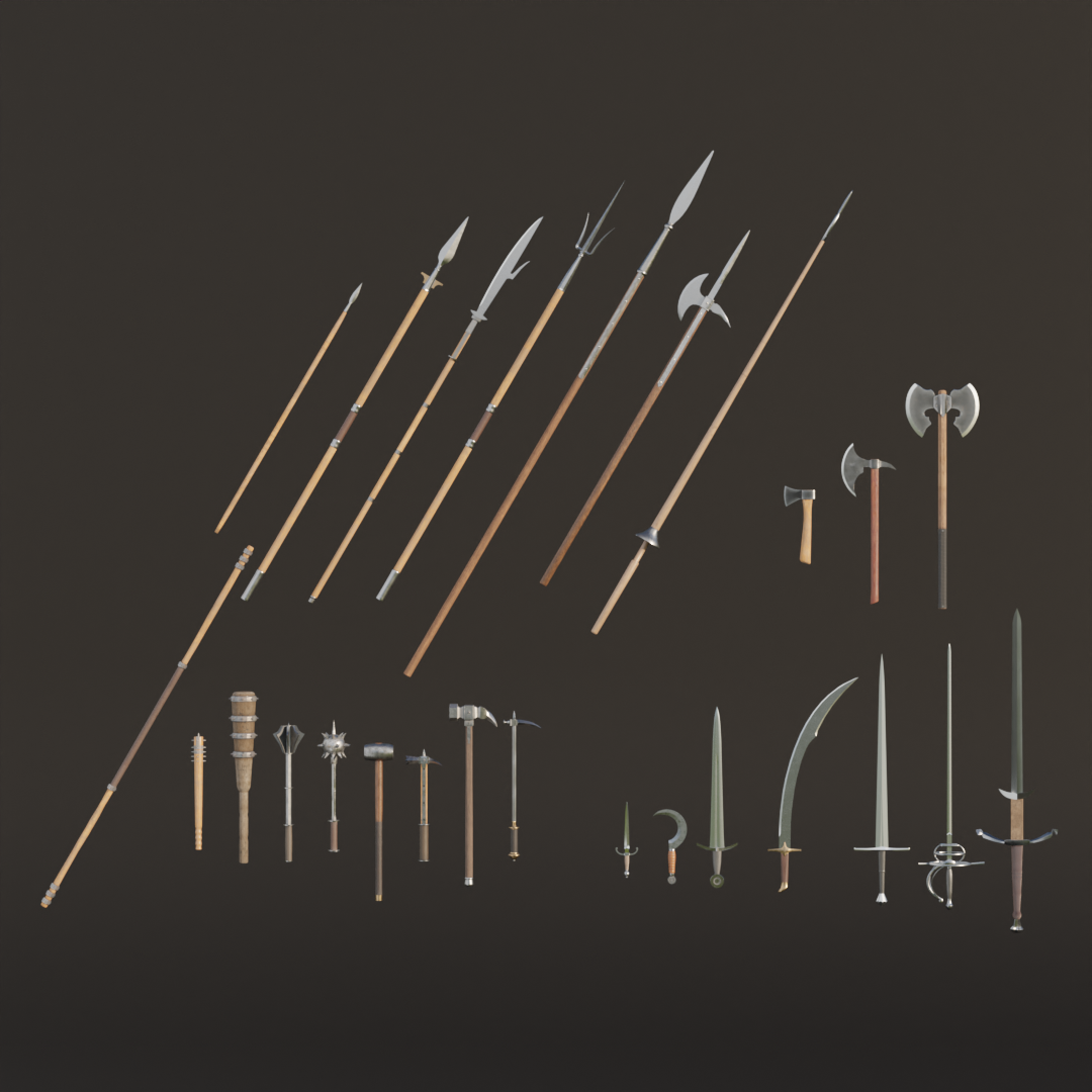 ファンタジーRPGなどでおなじみの武器の3Dモデル26種のセットです。
